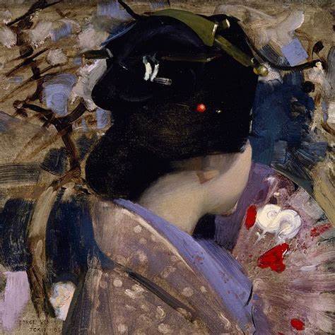 The Glasgow Boys have an excellent exhibition area on the groundfloor level, which drew my interest as it always does. I spent an hour or so looking at pictures by many of the boys and admired most particularly the works of E A Hornel and George Henry. A short journal entry was followed by drawing a simple sketch of the above picture. Japanese painting is another of my loves, and my recent interest in the works of Hiroshige and Hokusai has encouraged me to work specifically in black and white, with very pleasing results.